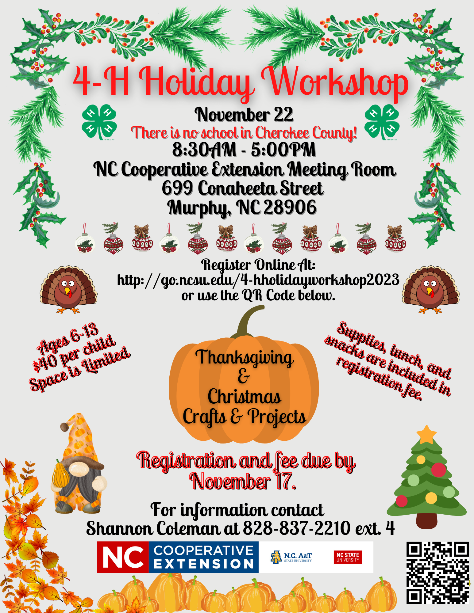 Join Cherokee County 4-H for a fun-filled day on November 22, 2023, for our 4-H Holiday Workshop. We will be making holiday crafts and having fun. We will make a Thanksgiving related crafts, as well as, all kinds of Christmas crafts.